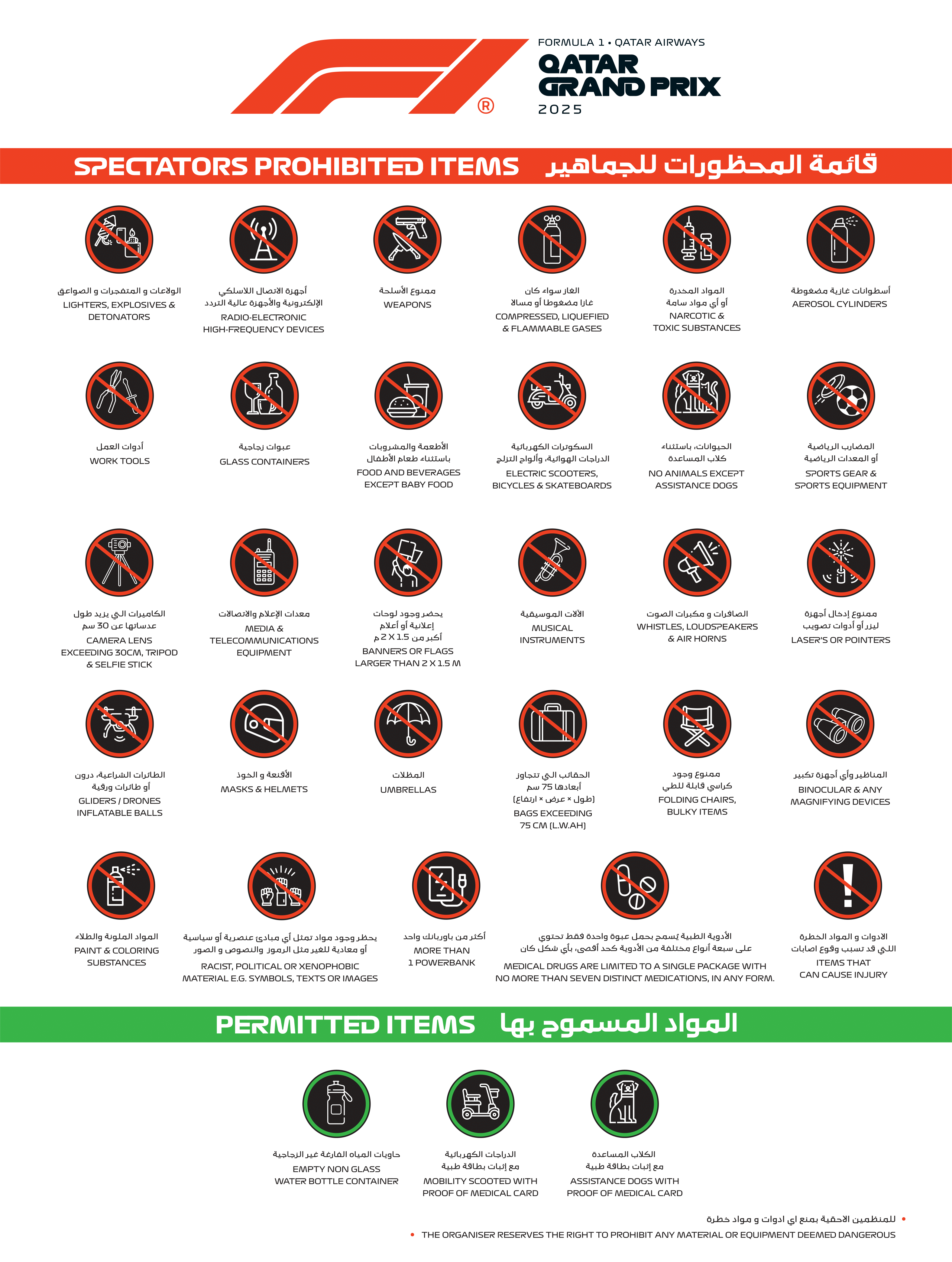 يخضع جميع الحضور لعمليات تفتيش أمني عند الوصول إلى الحلبة. ويُرجى الاطلاع مسبقًا على قائمة المحظورات للجماهير لتجنّب مصادرتها عند البوابات. كما يجب التأكد من أن الهاتف المحمول مشحون وبحوزته بيانات كافية، إذ يتعيّن إبراز التذاكر الرقمية عبر رمز الاستجابة السريعة (QR) عند بوابات الدخول وفي نقاط دخول المدرجات. ومن المهمّ الإشارة إلى أنه لا يُسمح بإعادة الدخول بعد مغادرة نطاق التفتيش الأمني في الموقع.