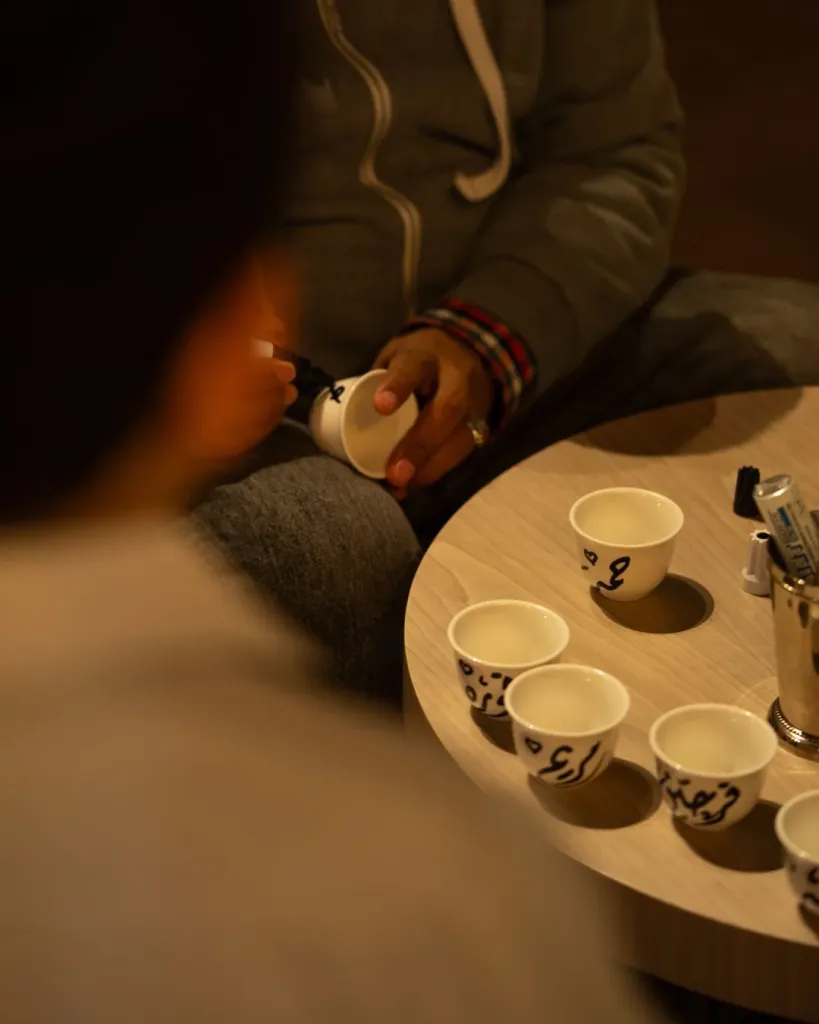 توفر منطقة الجلوس المرتفعة إطلالة مميزة على أجواء التجربة، مع أرائك موزعة بعناية في أنحاء المكان. كما تُقدّم مجموعة محدودة من الكبائن الخاصة مساحة أكثر عزلاً، تستوعب كل منها ما يصل إلى سبعة ضيوف، وتُقدّم داخلها تشكيلة فاخرة من المقبلات مباشرة إلى الطاولة.
