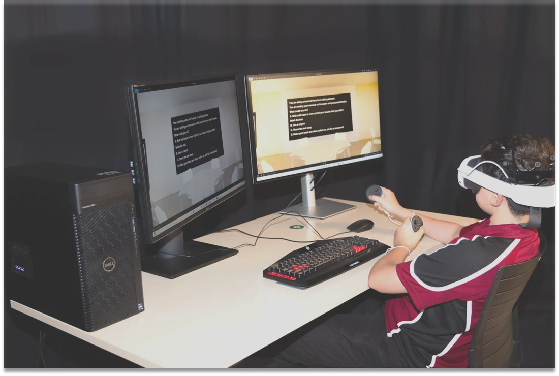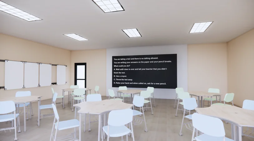 قلم المشاركون من ذوي اضطراب طيف التوحد بتنفيذ مهام في فصول دراسية افتراضية غامرة تم إعدادها تحت ظروف إضاءة مختلفة، بينما تم مراقبة نشاط أدمغتهم باستخدام جهاز تخطيط كهربية الدماغ (EEG). تراوحت المهام بين مسائل رياضية لاختبار المعالجة المنطقية والتحليلية؛ وقراءة نصوص والإجابة على أسئلة لقياس التركيز والاستيعاب والفهم؛ ومهام حل المشكلات التي تتطلب اتخاذ قرارات وانتباهاً مستمراً.